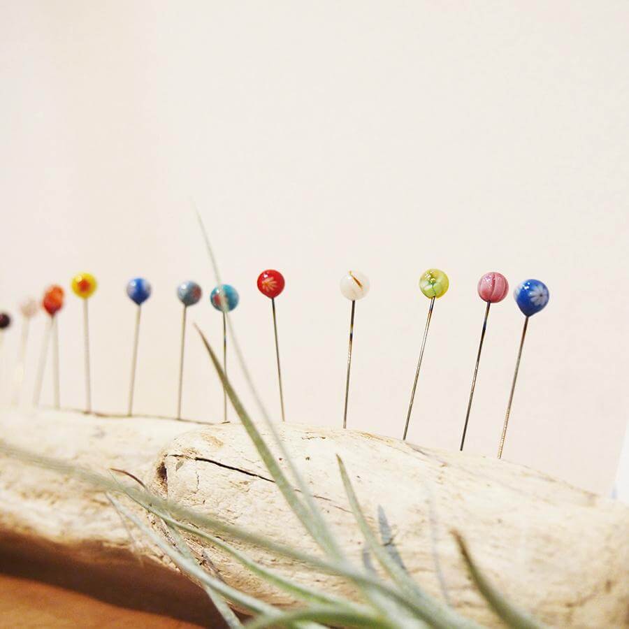 Cohana's Tombo-dama Sewing Pins are made with "millefiori," which means " thousands of flowers'' in Italian. It is a glass rod with a floral pattern inside.The pattern of a Millefiori rod is designed by combining colored glass bars. In the very beginning the rod is short and Thick, but it is heated in a furnace and pulled until a diameter of 3 to 8 mm while still maintaining the cross section's design.