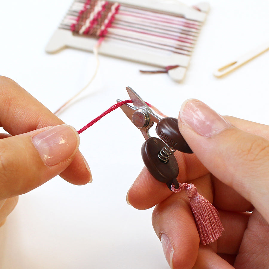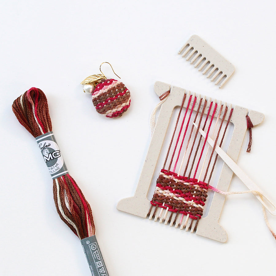 ポケットサイズのミニ織り機・くし・針とタテ糸が入っているので、すぐに織り始められます。タテ糸は使いやすい綿糸5種類を各2m巻いたセットが入っています。