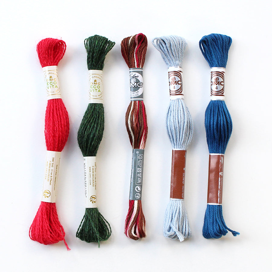 DMCの豊富な糸の中から、表情が異なる3種類5色をセレクトしました。